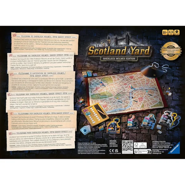 Dans cette édition de Scotland Yard, Sherlock Holmes et ses coéquipiers sont à la poursuite du redoutable professeur Moriarty.