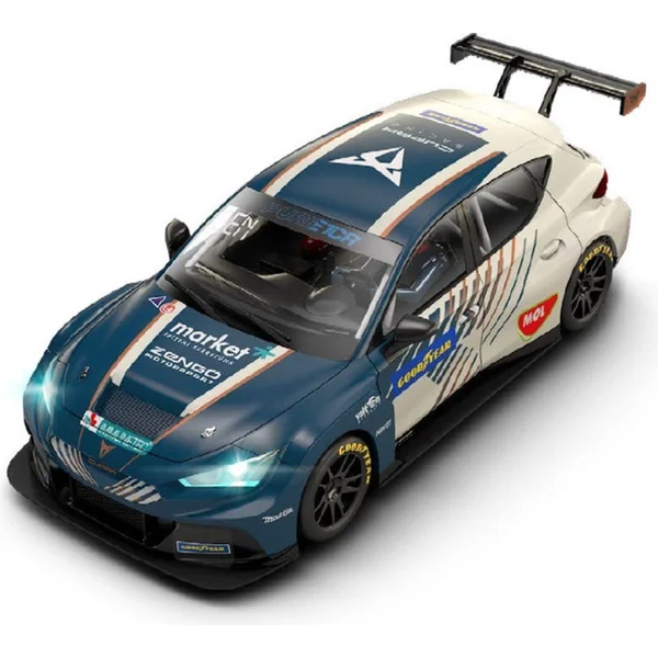 Voiture de circuit SCX Advance Cupra ETCR Gene à l’échelle 1:32, version 2.0, pour les circuits numériques SCX Advance. La voiture est équipée d’un éclairage LED. Sur le châssis se trouve un interrupteur digital/analogique – la voiture peut donc être utilisée sur le circuit numérique SCX Advance ainsi que sur le circuit analogique SCX Original.