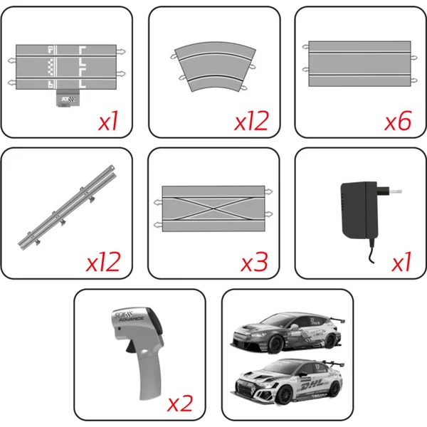 La piste de course électrique SCX Advance Touring Series à l’échelle classique 1:32 pour des courses plus palpitantes – une excellente piste numérique avec possibilité de dépassement dans les croisements (aiguillage contrôlé par la manette) et des glissières. L’emballage contient deux manettes sans fil avec interrupteur d’aiguillage, deux voitures de course numériques détaillées AUDI RS LMS TCR-DHL et CUPRA LEON COMPETICION – J. FILIPPI, qui sont équipées de lumières LED. Surface de déploiement : 288 x 126 cm. La composition de la piste est très simple, il suffit d’emboîter les différentes pièces de la piste, de coupler les manettes avec les voitures et vous pouvez commencer à courir.