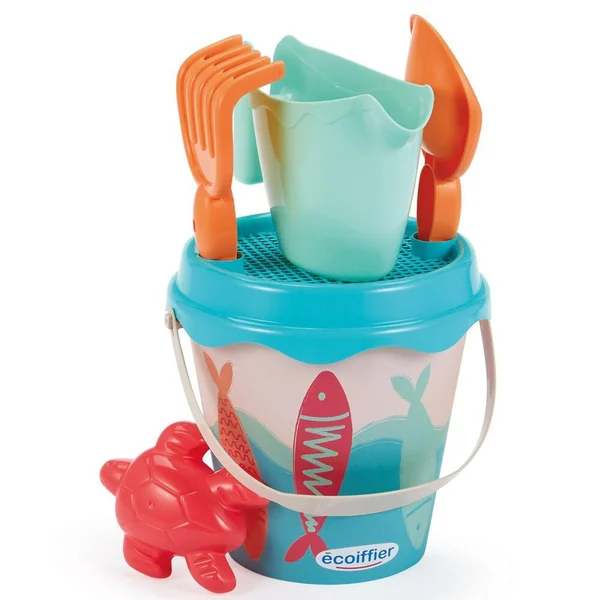 Seau de 17 cm décoré sur le thème de la sardine, avec arrosoir, pelle, râteau, tamis et moule à sable.