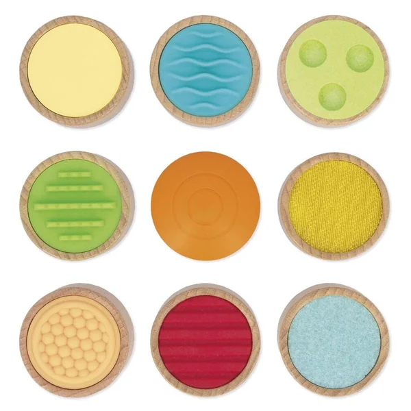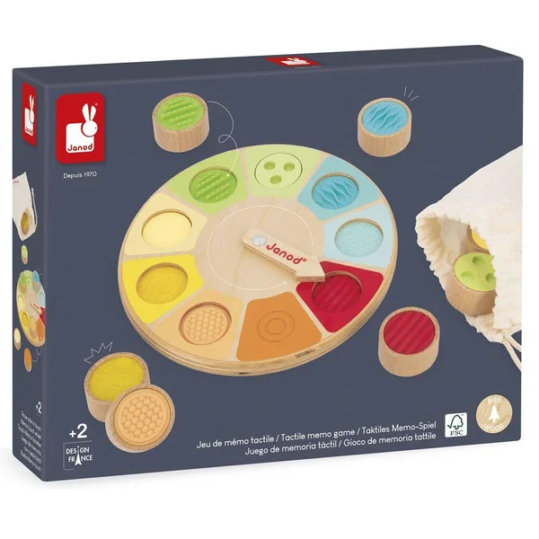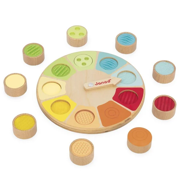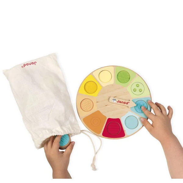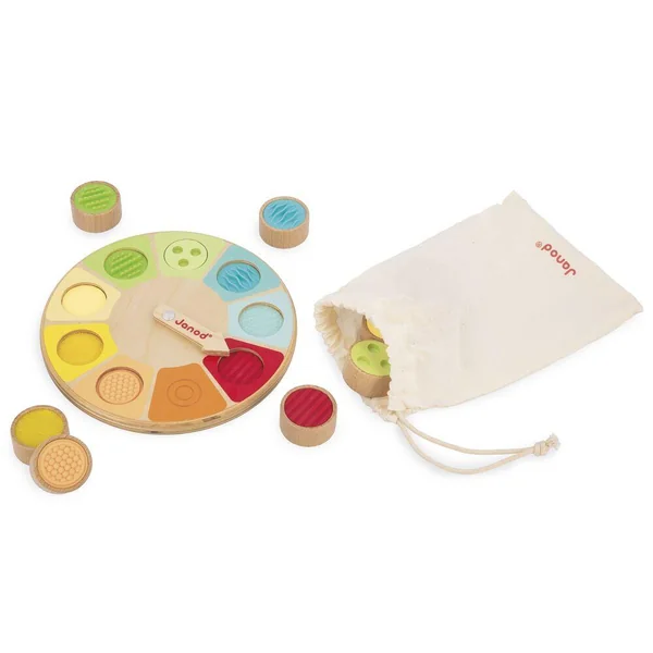 Découvrez la roue sensorielle de Janod ! Voici un jeu de mémo tactile pour les plus petits. Il suffit de faire tourner la flèche sur le plateau et de retrouver dans le sac en coton la pièce correspondante, juste en la touchant ! Le jeu se compose de 9 pièces en bois avec des textures et des matières différentes : feutrine, scratch, surface plane, bois texturé (2 pièces) et silicone texturé (4 pièces). Développe le sens du toucher et la coordination main/oeil. Jouet en bois FSCTM. Jouet d’éveil pour les enfants à partir de 2 ans.