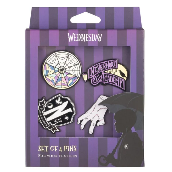 Lot de quatre pins fabriqués en alliage de zinc avec finition émaillée. Ils sont dotés d’une pointe à l’arrière pour les insérer dans le tissu et d’une broche papillon métallique, qui se place à l’extrémité de la pointe pour assurer leur fixation. Le pin se libère en appuyant sur le mécanisme de la broche. Dimensions : 5 x 5 cm environ.