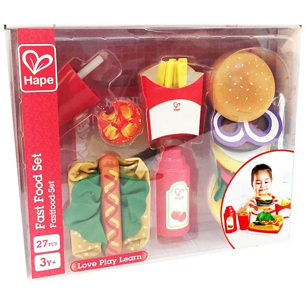 Ce soir, on mange au fast-food ! Cet ensemble de dîner à l’américaine comprend un menu avec un burger, un hot-dog, des frites et du soda, très réalistes. FAQ