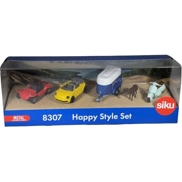 Set HAPPY STYLE composé de 4 véhicules et 1 accessoire, fidèle à l’original en métal avec des pièces en plastique, pneus en caoutchouc et portes qui s’ouvrent