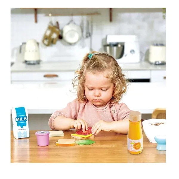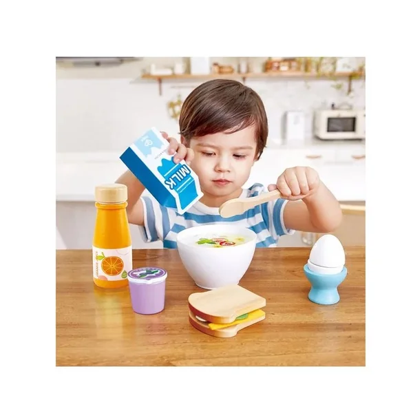Préparez-vous pour le repas le plus important de la journée avec cette ensemble pour le petit-déjeuner. Comprend un yaourt avec couvercle ouvrant, du lait et une bouteille de jus d’orange qui clique en tournant le capuchon. Comprend également un œuf avec coquetier, un bol de flocons d’avoine avec une cuillère, deux tranches de pain grillé avec une rondelle de tomate, de la salade et du fromage.