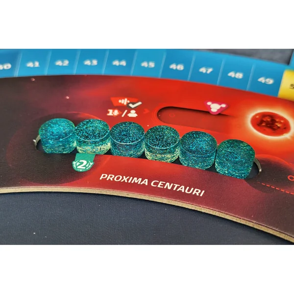 Mon idée de départ était de créer des jetons en verre avec des paillettes en forme de « 1 » et de « 0 » à l’intérieur, mais il semble impossible d’ajouter des paillettes au cristal. La résine époxy est la meilleure alternative : elle est presque aussi transparente que le cristal. De plus, elle offre une meilleure durabilité : les jetons ne se rayent pas et ne s’usent pas aussi facilement que ceux en verre. J’ai trouvé des fabricants de paillettes en forme de chiffres, mais malheureusement, ils ne pouvaient pas fournir de paillettes uniquement composées de 0 et de 1 en taille suffisamment petite. J’ai donc voulu voir à quoi ressembleraient des paillettes classiques et j’adore le résultat. Pour moi, les paillettes évoquent des données voyageant dans l’espace, que l’on écoute attentivement pendant la partie.