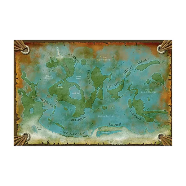 Poster recto-verso de dimensions 60 x 80 cm qui représente les cartes d’Héos (planète) et de l’Héossie (continent principal du jeu) légendées pour le jeu de rôle Shaan.