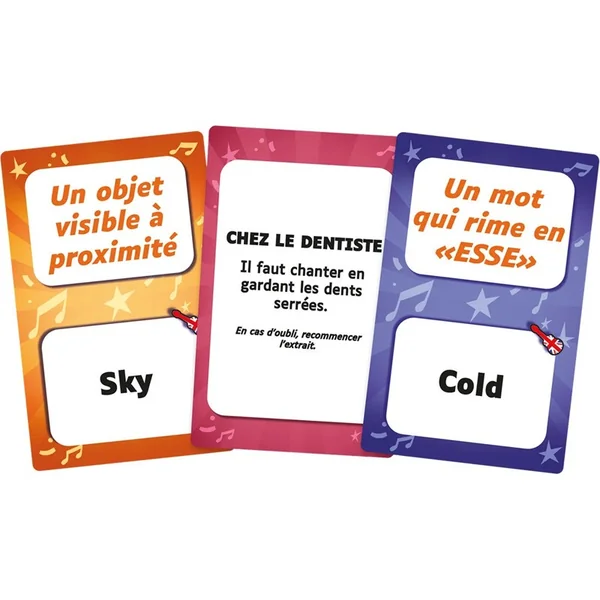 Sur une carte, vous trouverez un mot (ou thème) français et un en anglais afin de varier les plaisirs ! Vous avez également le droit de réciter un extrait de poème et de fable en plus des chansons !