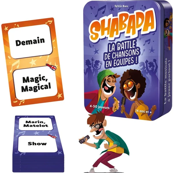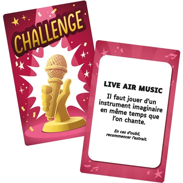 Dans ce fameux jeu, deux équipes s’affrontent en chantant ! Trouvez donc un maximum de chansons avec les mots ou catégories imposés par la carte et faites un ping pong musical jusqu’à ce qu’un des deux groupes sèche ! Faites-vous plaisir : chantez les extraits à tue-tête !