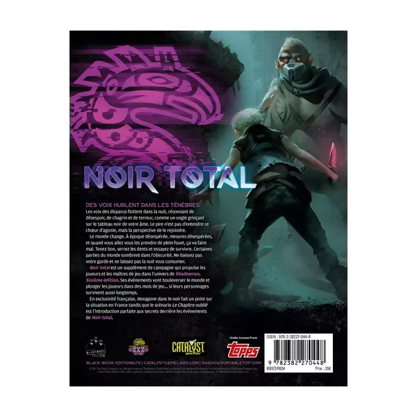Shadowrun 6 – Noir Total est un supplément d’aventures pour le jeu de rôle Shadowrun, édité par Black Book Editions utilisant un système à base de D6.