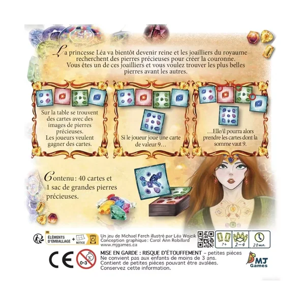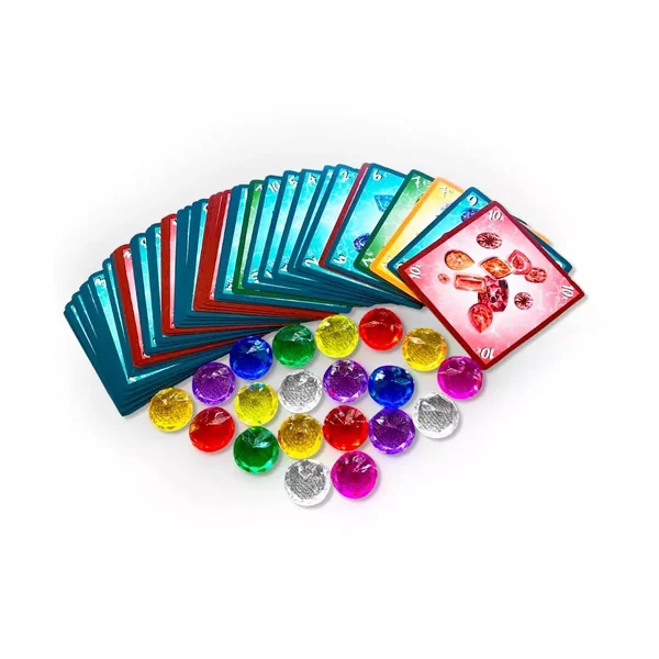 Une partie se joue en plusieurs manches. Le jeu est composé de 40 cartes et d’un sac de pierres précieuses qui sont les points de victoire. Les cartes sont réparties en 4 catégories : 1 carte diamant, 3 cartes émeraudes, 9 cartes rubis et 27 cartes saphirs. 4 cartes sont posées face visible au centre du jeu au début de chaque manche. Ce sont des cartes à prendre. Les joueurs prendront et poseront des cartes sur la table. Ainsi, les cartes à prendre vont varier pendant la manche.