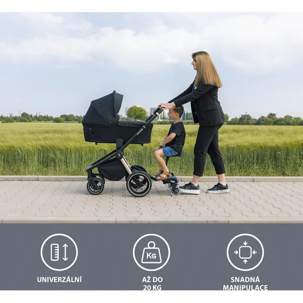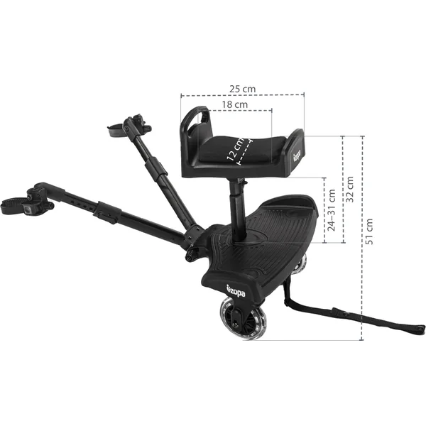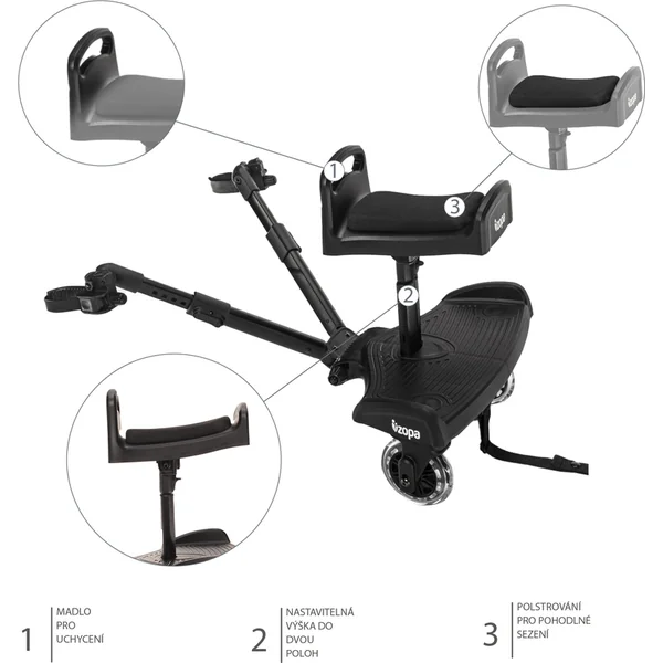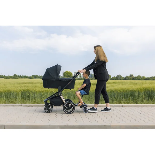 Idéal pour les longs trajets – le siège auto Segboard facilite le voyage pour le frère ou la sœur aîné(e). Le siège rembourré offre une conduite confortable. La poignée pratique à l’avant permet à l’enfant de s’accrocher, ce qui aide à mieux maintenir l’équilibre. Le siège peut être facilement fixé au repose-pieds et la hauteur peut être ajustée à l’aide d’un mécanisme de verrouillage.