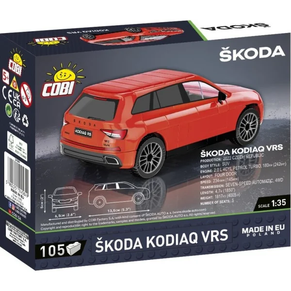 Le modèle à l’échelle 1:35 composé de 100% de briques COBI reproduit très fidèlement les formes caractéristiques de la voiture originale Škoda Kodiaq. Les blocs ont des impressions durables qui ne s’usent pas même avec une utilisation intensive. Les roues pivotantes équipées de pneus sont idéales pour conduire le modèle pendant le jeu. Le modèle Kodiaq en briques COBI sera aimé non seulement par les enfants, mais aussi par les fans matures de briques de construction, les collectionneurs de jouets et les passionnés d’automobiles.