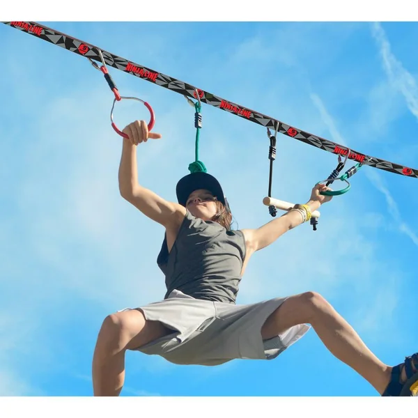 Crée ton propre parcours et entraîne-toi comme un Ninja ! Ligne Ninja de 11 m de long (soit une longueur utile de 9 m), 5 cm de large, avec boucle cousue 5. Cliquet en métal solide avec poignée en plastique et boucle cousue. 14 points d’accrochage cousus dans la sangle permettent d’attacher les accessoires inclus aux mousquetons Delta (à vis). Accessoires inclus : 1 anneau transversal en plastique ABS, 2 anneaux de gymnastique, 2 trapèzes et 2 poings de singe. Les obstacles ou accessoires peuvent être attachés individuellement dans l’ordre souhaité. La Ninja-Line peut également être utilisée comme slackline ou sangle d’équilibre, si les accessoires ne sont pas accrochés. Charge maximale supportée : 113 kg. Avec un sac de transport et un manuel d’instructions inclus. Pour une personne uniquement. A utiliser sous la surveillance d’un adulte. Le montage doit être effectué par un adulte. Utilisation en plein-air. Réservé à un usage privé. Poids net du produit : 4.5 kg. Diamètre minimum de l’arbre pour fixer la Ninja Line : 30 cm soit environ 1 mètre de circonférence. Hauteur maximum entre la slackline (sangle) et le sol : 30 cm. Développe la force musculaire et augmente la confiance en soi. Sac de transport en nylon, dimensions 42 x 25 x 2 cm.
