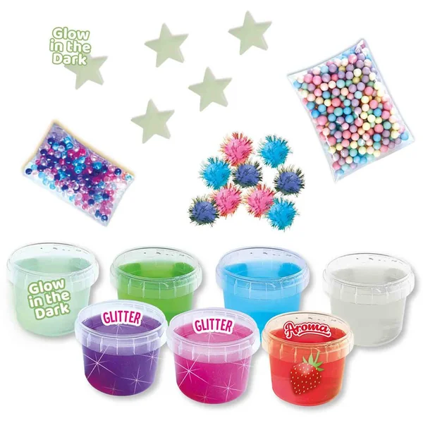 Mélange en folie ! Cet ensemble de slime est le rêve de chaque enfant. Avec un total de sept pots de slime, les possibilités sont infinies. Mélangez les couleurs de slime ou combinez le slime avec des perles, des billes en mousse, des étoiles phosphorescentes ou des pompons pailletés. Tout est possible avec l’ensemble Mélange en folie ! Le slime de SES Creative est sûr pour les enfants à utiliser et répond à toutes les exigences de sécurité.
