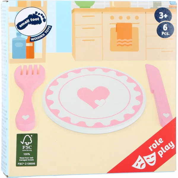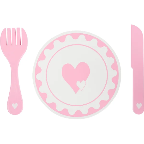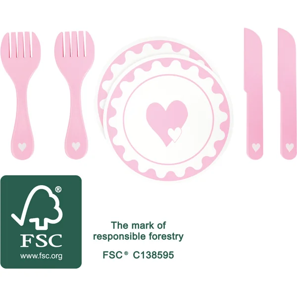 Un service de table féerique ! La nourriture de la cuisine des enfants sera encore meilleure grâce à ces assiettes, et les enfants pourront apprendre à bien mettre la table en jouant. Le petit service en bois est décoré de cœurs.