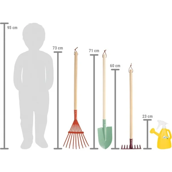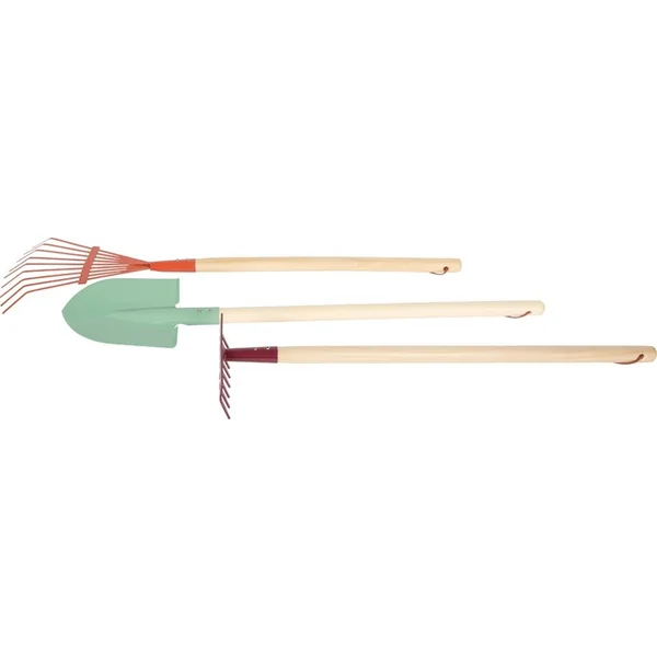 Les outils sont fabriqués à partir de matériaux durables et ont la taille idéale pour les petites mains d’enfants. Et quand le travail est terminé ? Grâce aux boucles à la fin des manches, vous pouvez facilement les accrocher et tout est rangé.