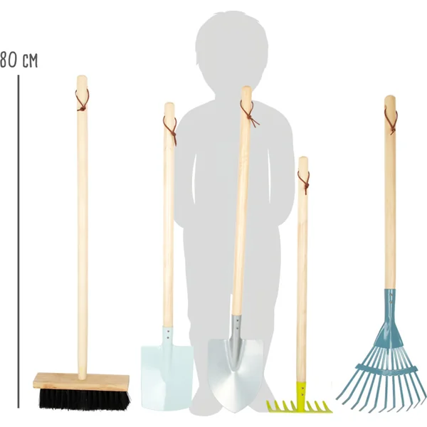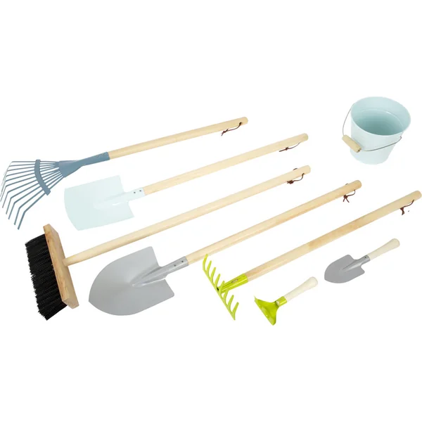 Ce set d’outils de jardinage complexe dans des couleurs modernes se compose d’une bêche, d’une pelle, de râteaux, d’un balai, d’une pelle et de deux petits outils de jardinage pour travailler dans le jardin. Une fois le travail terminé, les outils en bois robuste et en métal peuvent être correctement accrochés à des boucles pratiques. Ce set est un véritable « indispensable » pour tous les jeunes jardiniers.