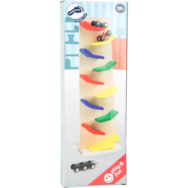 Les petits fans de voitures seront vraiment ravis avec cette tour en bois à cascade, car il y a du plaisir pour leurs yeux et leurs oreilles. Après le lancement, les petits véhicules articulés descendent les rampes. Les coureurs en bois dévalent la piste, offrant ainsi beaucoup de plaisir aux enfants à chaque descente.