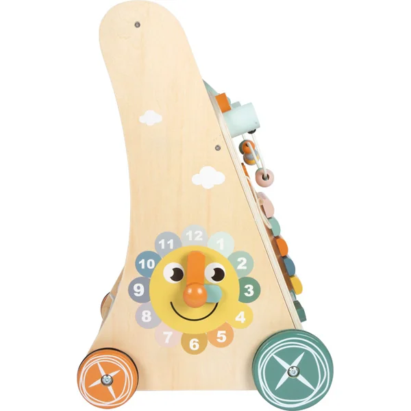 Le xylophone en bois avec 5 touches offre une stimulation acoustique, tandis que les nombreux éléments coulissants et le labyrinthe à perles avec des perles colorées de différentes tailles entraînent la motricité fine. Les roues dentées, les plaques basculantes, le jeu d’encastrement avec 3 cubes différents et l’horloge avec des aiguilles mobiles offrent non seulement du plaisir mais aussi un apprentissage par le jeu. Le filet à l’arrière du chariot fournit un espace de rangement pratique pour les jouets. Les roues ont des anneaux en caoutchouc conçus pour empêcher le glissement et permettre une conduite silencieuse et fluide.