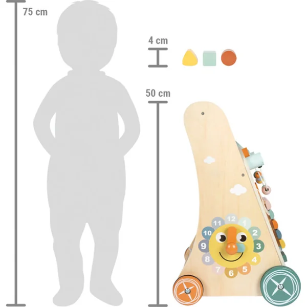 Le chariot est stable grâce à sa forme triangulaire et, avec son design coloré en douces teintes pastel et une grande quantité de bois naturel apparent, il deviendra un accessoire attrayant pour toute chambre d’enfant. Il s’accorde parfaitement avec les autres jouets de la gamme Safari.