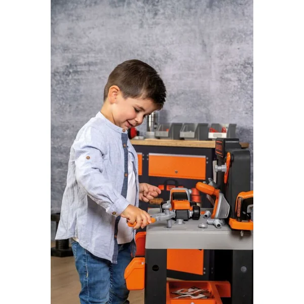 Centre de travail réaliste Smoby Black + Decker avec 83 pièces d’accessoires, 7 outils et un véhicule.