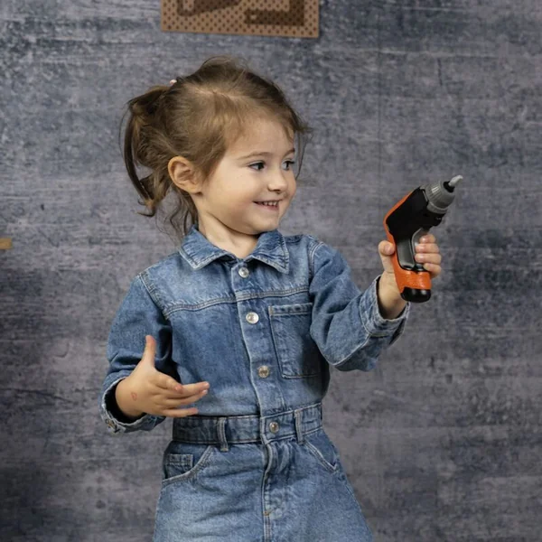 Grand et robuste, ce centre de travail ressemble à un véritable établi de papa. La grande surface de travail au design en bois offre suffisamment d’espace pour divers outils. Avec le tournevis à batterie mécanique, il est possible de visser différents véhicules à partir des blocs de construction.