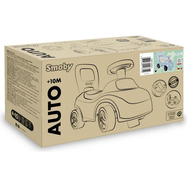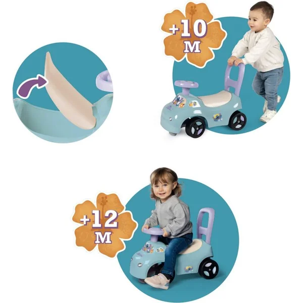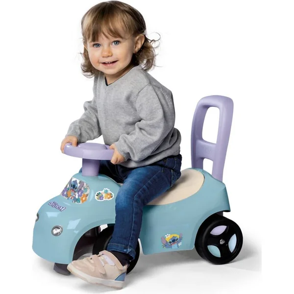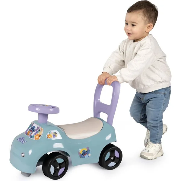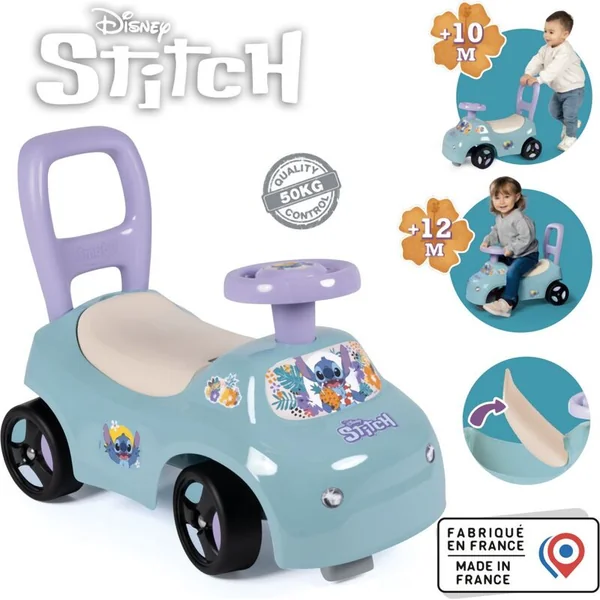 Stabilisateur de marche en forme de voiture avec des motifs Stitch. 2 en 1, il sert à la fois de trotteur et de porteur.