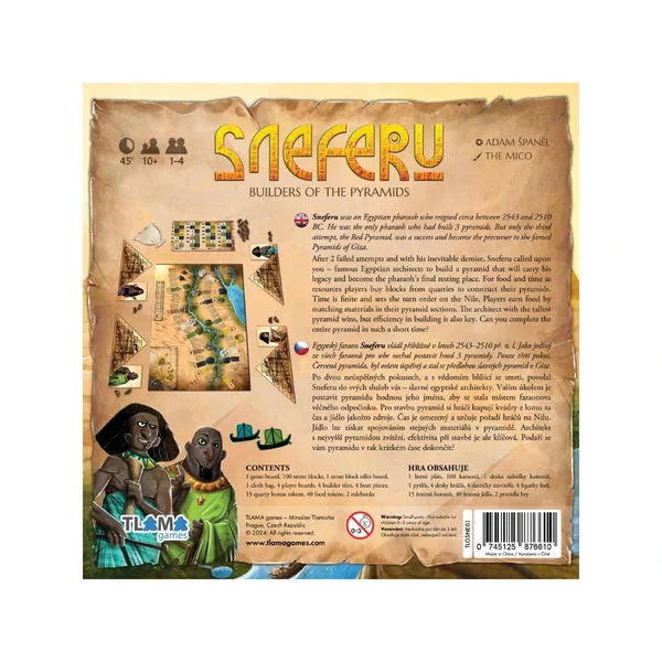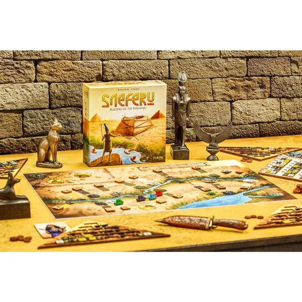 Sneferu est un jeu abstrait accessible à toute la famille, imaginé par Adam Španěl (Project L). Les joueurs y tentent de gagner la faveur du grand pharaon en construisant la plus haute pyramide possible à partir de blocs extraits des carrières (chaque bloc étant composé de deux des cinq matériaux disponibles). Ces blocs s’obtiennent en dépensant les deux ressources du jeu : la nourriture et le temps.