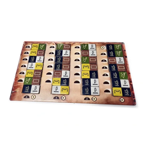 Le temps, représenté par votre embarcation avançant sur le Nil, est une ressource précieuse et limitée qu’il est impossible de récupérer. L’ordre de tour est déterminé par la position des bateaux : c’est toujours au joueur le plus en arrière, ayant consommé le moins de temps, de jouer. Vous pouvez obtenir de la nourriture en complétant des étages de votre pyramide avec des matériaux identiques.