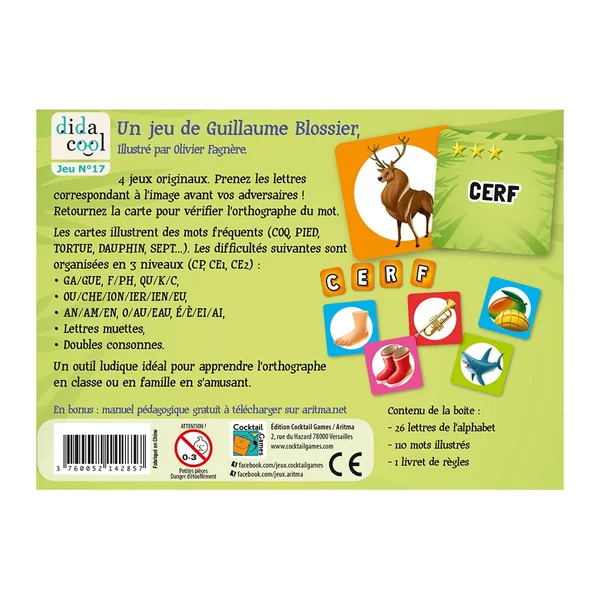 SpeedoDingo est un jeu de lettres qui utilise des mots d’usage fréquent mais qui sont difficiles à écrire. À l’école ou à la maison, ce jeu permet à l’enfant de progresser dans l’apprentissage du français – 3 niveaux de progression (à partir de 6 ans, 7 ans, 8 ans).