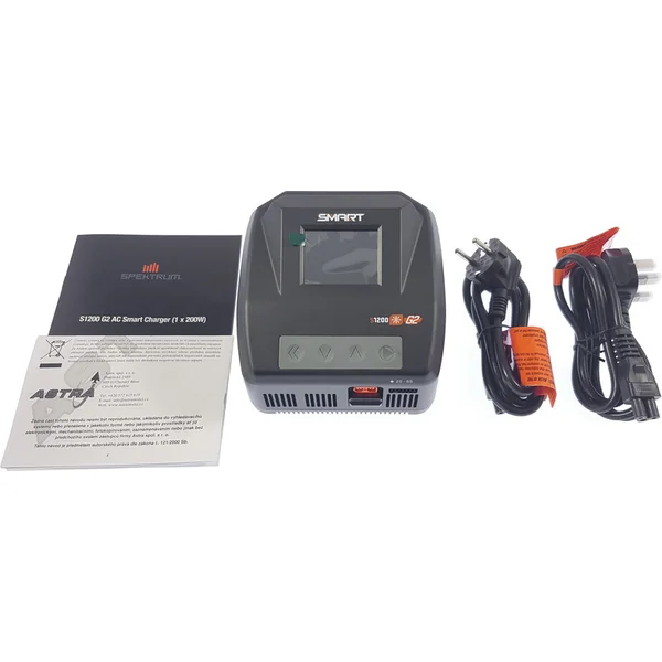 L’emballage contient le chargeur Spektrum Smart S1200, un câble d’alimentation, un manuel en SK, un manuel en EN, DE, FR, IT.