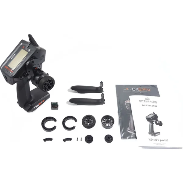 L’emballage contient l’émetteur RC DX5 Pro 2021, le récepteur, des inserts angulaires de 10° et 15°, 2x poignées de rechange, un volant plus petit, un limiteur de mouvement du volant de 32°, 36°, une roue de volant de rechange. Manuel en SK et mode d’emploi en EN, DE, FR, IT.
