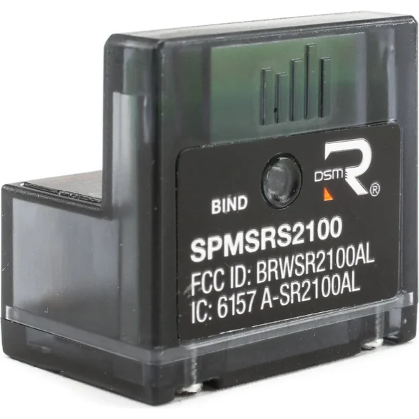 Le récepteur micro 3 canaux Spektrum SR2100 DSMR® avec antenne intégrée, réponse rapide de 5,5 ms, revêtement Reliakote contre l’humidité et bouton de liaison pour un appairage facile.