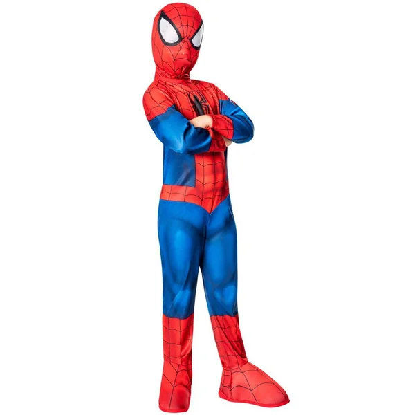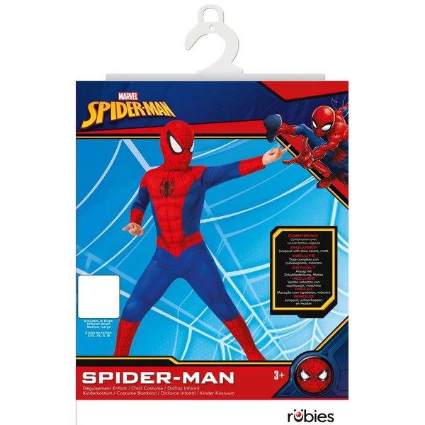 Une combinaison à manches longues en jersey imprimée rouge et bleue avec logo araignée sur le buste. Des couvre-bottes intégrés en mousse. Une cagoule à l’effigie de Spider-Man avec attache velcro dans le cou.