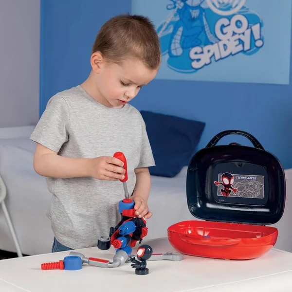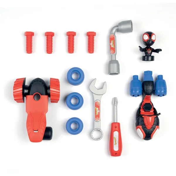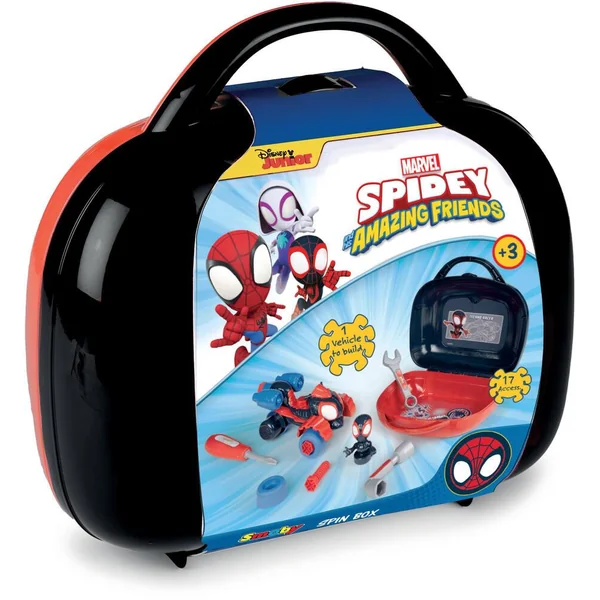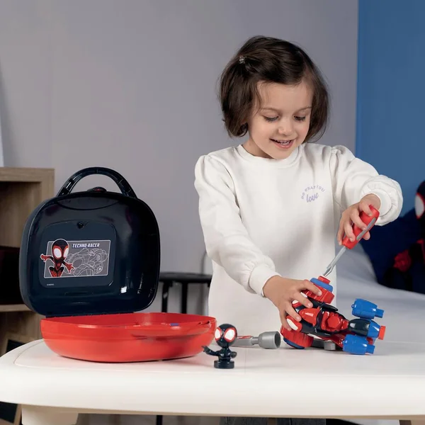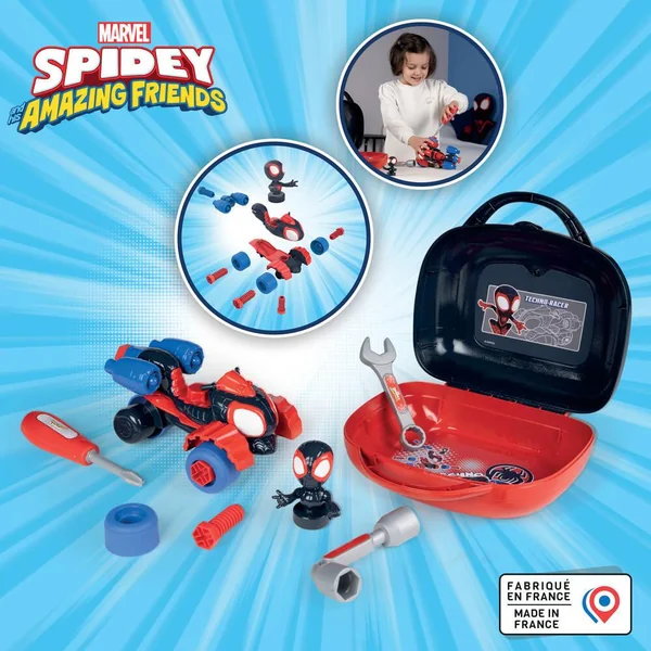 Mallette outils Miles Morales, alias Spin de Spidey et ses amis extraordinaires avec poignée pour la transporter partout. Inclus : 1 clé à pipe – 1 tournevis – 1 clé plate – Vis – Roues – Le quad de Spin à construire –