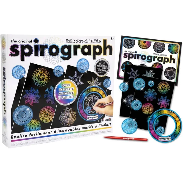 SPIROGRAPH Multicolore et Pailleté Une toute nouvelle version encore plus originale, stylée et colorée ! Les feuilles sont désormais magiques… Toutes les couleurs de l’arc-en-ciel se cachent sous le film noir. Dessinez vite des spirales à l’infini pour faire apparaître ces si belles couleurs ! Une activité manuelle parfaite afin de développer sa créativité et son imagination en réalisant de magnifiques dessins. 7 accessoires inclus.