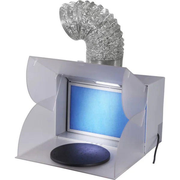 Spraycraft boîte de pulvérisation avec extraction, table tournante de 220 mm, tuyau de ventilation et filtre. Alimentation 230 – 240 V/50 Hz, capacité d’aspiration 3 m3/min, espace de travail intérieur 40,5×21,5×29 cm. Il est idéal pour pulvériser des modèles en plastique et similaires.
