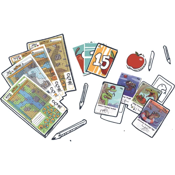 Vous avez faim ? Dans le jeu de Flip & Write Sssnake, faufilez-vous à travers différents lieux, utilisez vos capacités acquises, dévorez de nombreuses pommes fraîches et devenez le plus long des serpents. Mais attention à ne pas vous mordre vous-même sous peine d’être éliminé ! Au début de chaque manche, une carte pomme est révélée pour déterminer où les fruits tomberont de l’arbre. Celui qui mange beaucoup de pommes grandit plus vite et obtient de nouvelles capacités pour accéder encore plus facilement aux délicieuses pommes. La partie se termine lorsque l’avant-dernier serpent est éliminé.