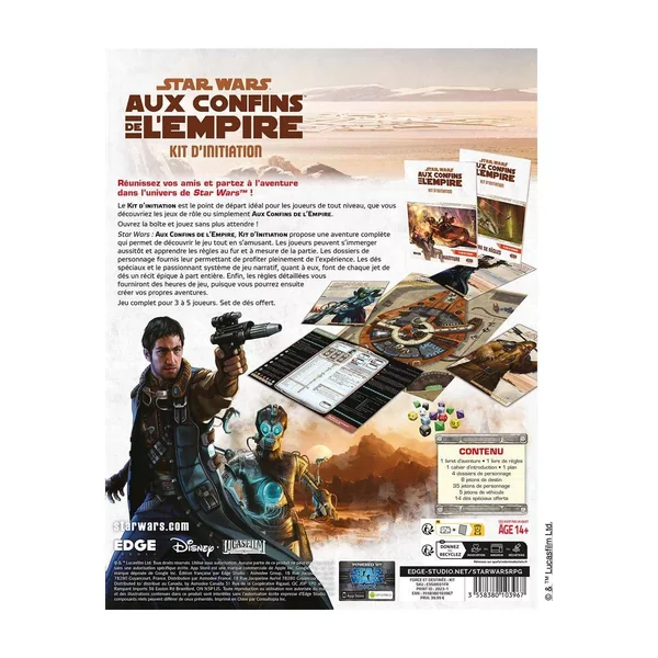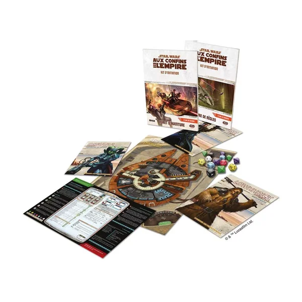 Le Kit d’Initiation de Star Wars Aux Confins de l’Empire contient : 1 livret d’aventure, 1 livre de règles, 1 cahier d’introduction, 1 plan, 4 dossiers de personnage, 14 dés spéciaux, 8 jetons de destin, 35 jetons de personnage et 5 jetons de véhicule.