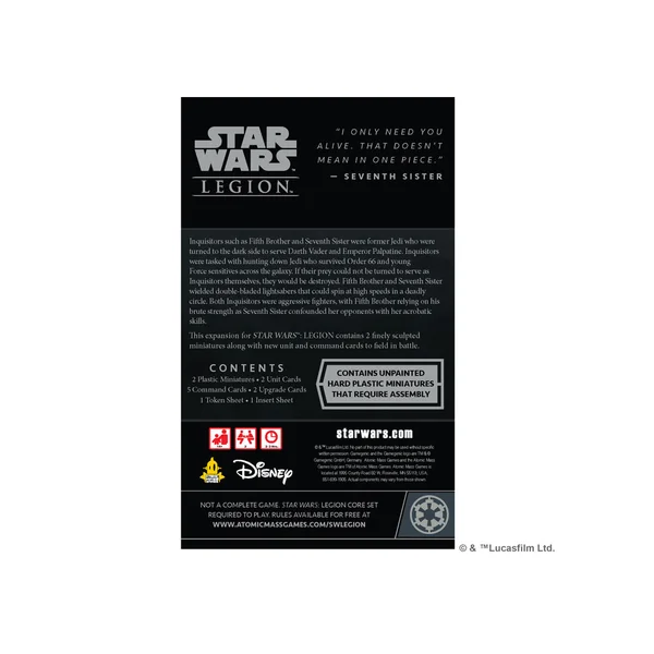 Deux terrifiants Inquisiteurs sont en chasse dans ce nouveau pack pour Star Wars™ : Légion ! Chargés de traquer les Jedi qui ont survécu à l’Ordre 66, le Cinquième Frère et la Septième Sœur sont des agents impériaux mortels qui renforcent les armées impériales avec encore plus d’utilisateurs de la Force. En plus de leurs capacités innées dans la Force et de leurs compétences au sabre laser, ce pack comprend également une nouvelle carte d’entraînement et 5 cartes de commandement qui améliorent encore leurs capacités de chasseurs de Jedi.