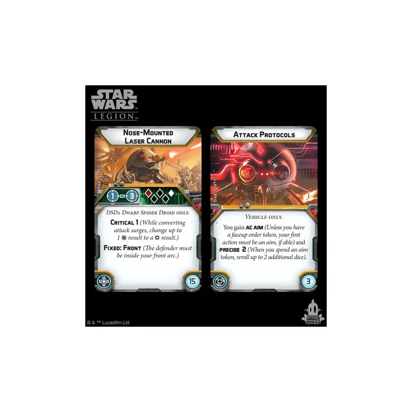 Dans cette extension, vous trouverez tout ce dont vous avez besoin pour ajouter un droïde araignée nain DSD1 à vos armées séparatistes en tant qu’unité de soutien. La nature polyvalente de ce droïde est illustrée par une figurine en plastique dur finement détaillée et non peinte, qui peut être personnalisée avec un canon laser monté sur le nez, un lance-flammes ou un blaster ionique. Ces modifications physiques trouvent une application pratique dans huit cartes d’amélioration qui vous invitent à équiper votre droïde araignée nain DSD1 d’une variété d’armes et de protocoles de combat.