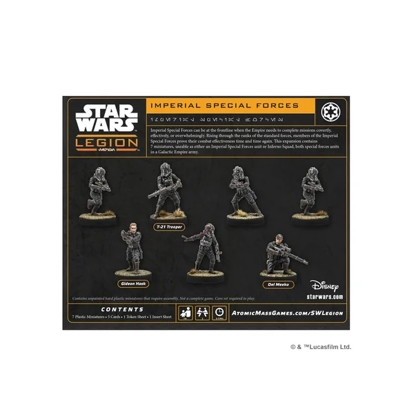 Les Forces Spéciales Impériales sont envoyées en première ligne lorsque l’Empire souhaite effectuer des missions d’infiltration, d’extraction ou d’assaut. Sortant des rangs des troupes standards, les membres des Forces Spéciales Impériales ont prouvé leur efficacité au combat à maintes reprises. Cette extension vous permettra d’ajouter 7 figurines à votre armée de l’Empire Galactique, afin de constituer une unité des Forces Spéciales Impériales ou de l’Escouade Inferno. Les figurines de Gideon Hask et Del Meeko peuvent être montées avec ou sans leurs casques.