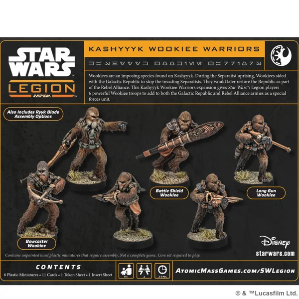 Les Wookiees sont une espèce imposante originaire de Kashyyyk. Pendant le soulèvement séparatiste, les Wookiees se sont rangés du côté de la République Galactique pour arrêter l’invasion des Séparatistes. Ils ont ensuite contribué à restaurer la République en tant que membres de l’Alliance Rebelle. Cette extension Kashyyyk Wookiee Warriors offre aux joueurs de Star Wars: Legion 6 puissantes figuiiens de Wookiees à ajouter aux armées de la République Galactique et de l’Alliance Rebelle.