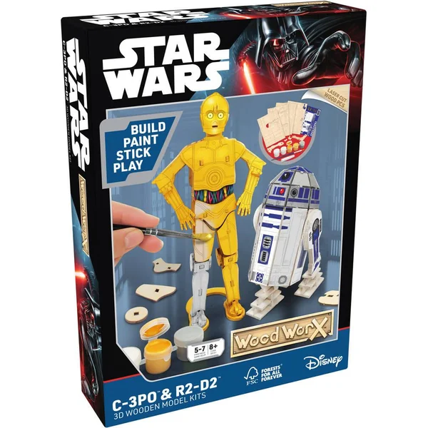 Wood WorX présente une recréation détaillée des droïdes préférés des galaxies C-3PO ™ et R2-D2 ™ présentés dans le film ‘Star Wars ™ A New Hope’. Suivez les instructions étape par étape pour simplement construire, peindre, coller et jouer ! D’autres styles disponibles à collectionner. La gamme Wood WorX est fabriquée avec du bois certifié FSC®. Le kit comprend des pièces en bois, des pots de peinture, de la colle, un pinceau, une feuille d’autocollants et des instructions étape par étape. Le meilleur de tous, vous l’avez fait vous-même !