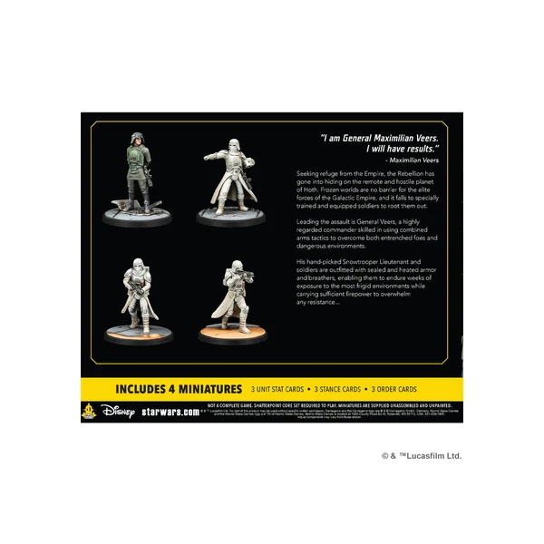 Le pack d’escouade Maximum Firepower présente l’emblématique et tactique commandant de l’Empire, le général Veers. Depuis sa première apparition au cinéma dans Star Wars : The Empire Strikes Back™, Veer est une force tactique, utilisant la force des Snowtroopers avec une efficacité brutale.