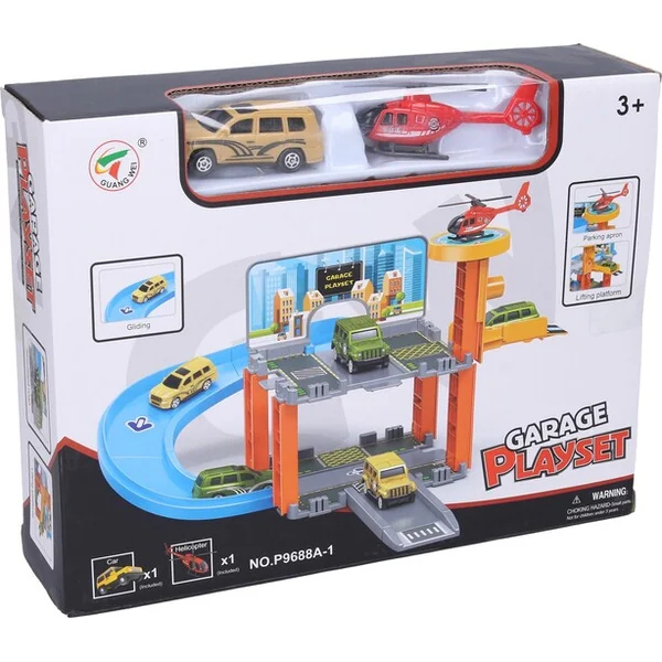 - Comprend une voiture (roue libre), un hélicoptère, un héliport et un ascenseur manuel.