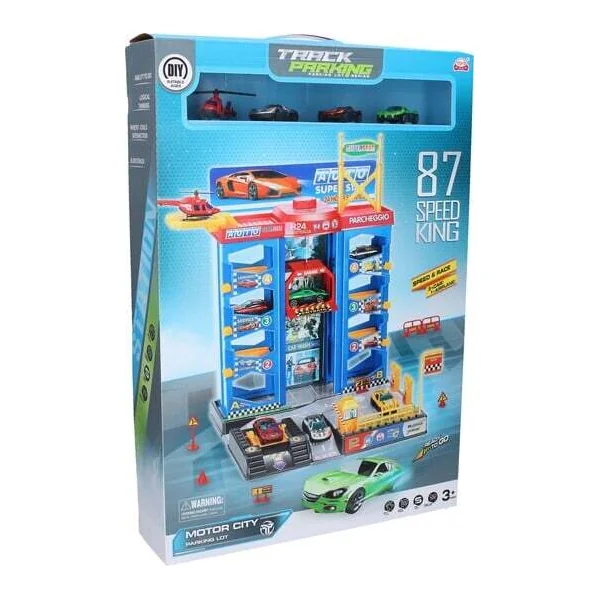 Station de parking avec 3 voitures en métal et un hélicoptère.
