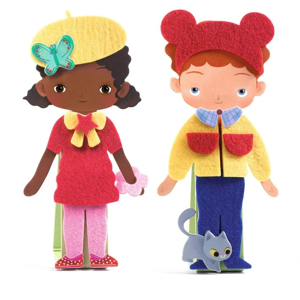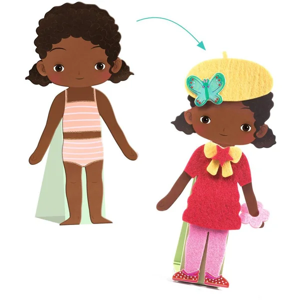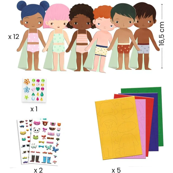 L’enfant s’amuse à habiller 6 personnages (3 garçons, 3 filles) avec de la feutrine autocollante. Il est temps de mettre de la couleur grâce aux stickers et aux strass.