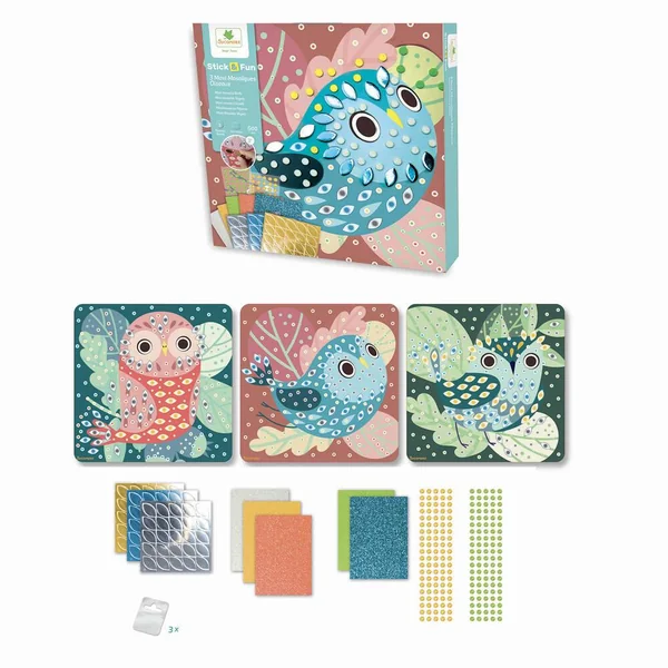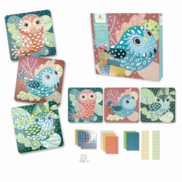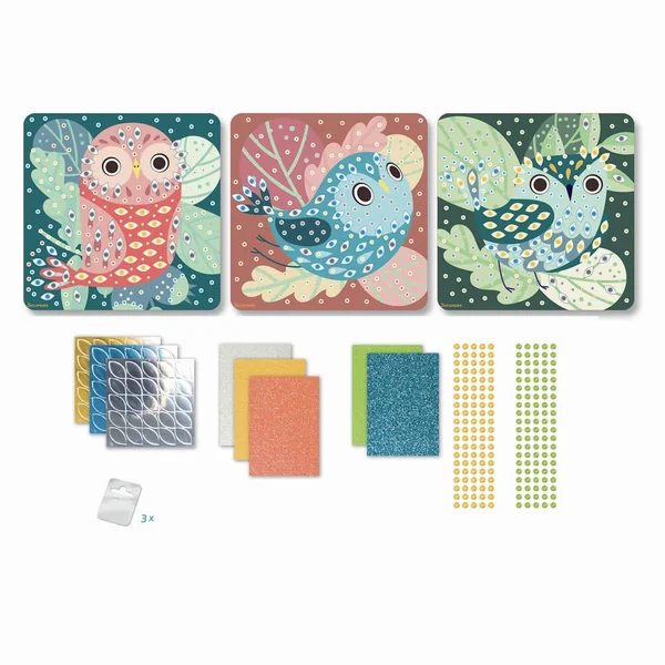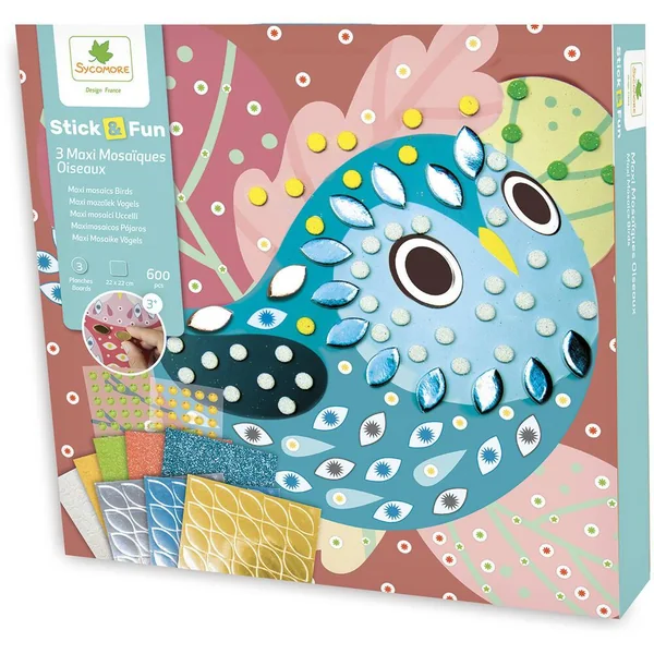 Facile et simple d’utilisation, il suffit de coller les maxi mousses et joyaux étincelants sur les graphismes correspondants et le tour est joué ! Réalise 3 magnifiques tableaux mosaïques sur le thème des oiseaux. Contient : 3 planches à décorer, 3 supports d’accroche mural, 600 maxi mosaïques colorées,gems et 1 notice.